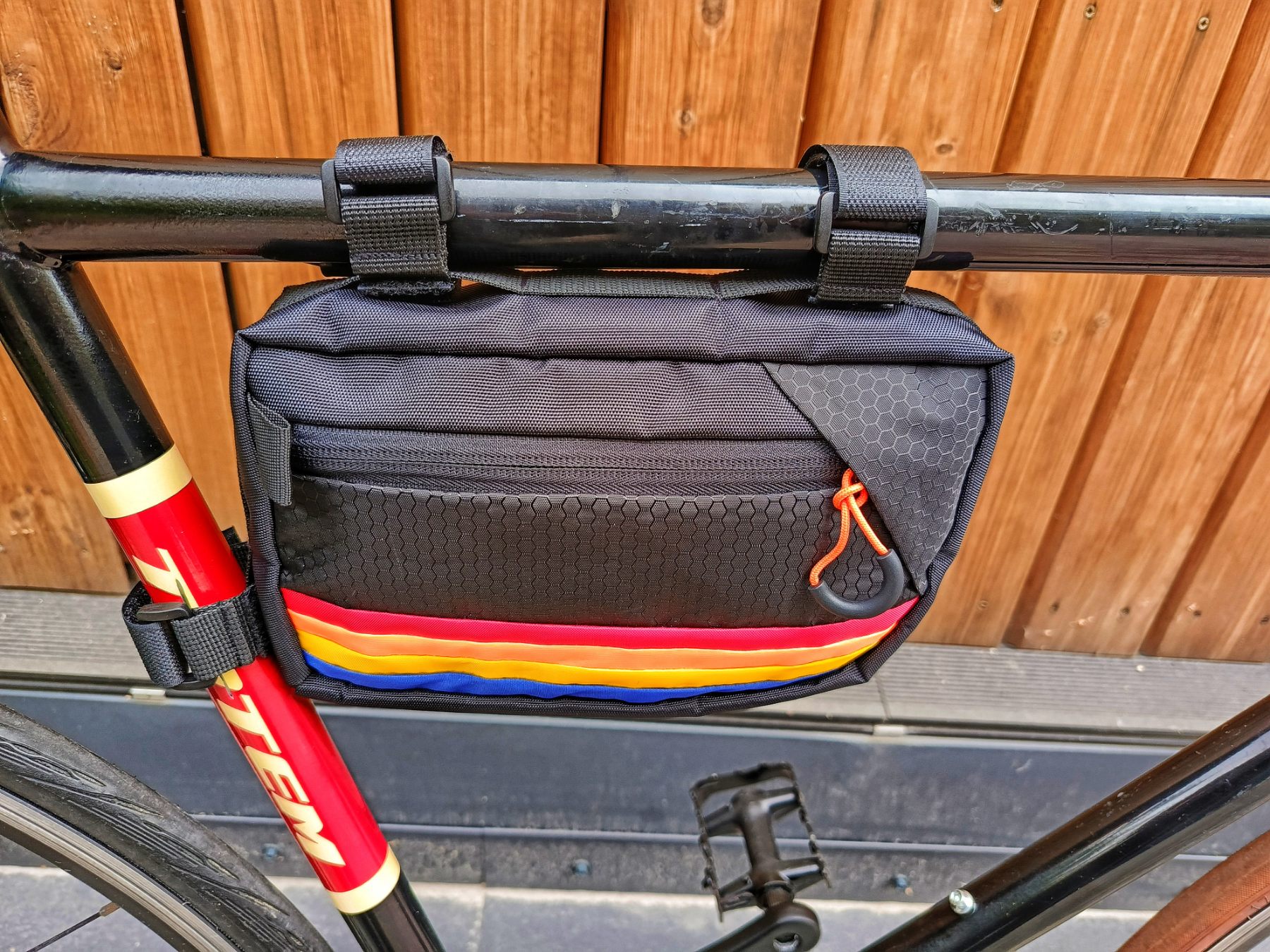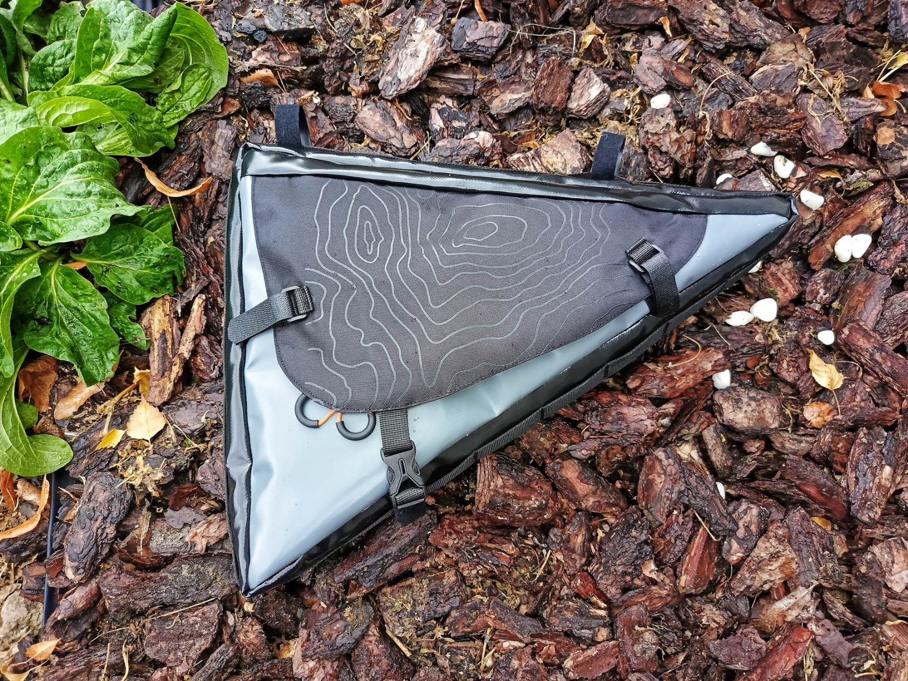 Сумка виготовлена з міцних і водовідштовхувальних матеріалів, що гарантує захист електроніки та акумулятора від вологи, пилу та механічних пошкоджень. Підрамна конструкція включає систему фіксації до труб рами за допомогою регульованих ременів із липучками, що дозволяє встановлювати сумку на велосипеди різної геометрії. Таке кріплення забезпечує надійність навіть при інтенсивному використанні та на нерівних трасах.